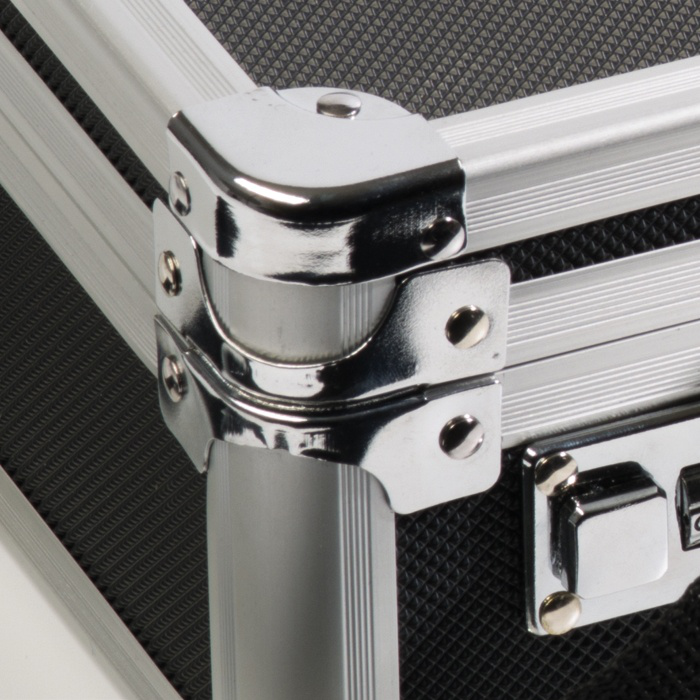 - Kofferten har høy kvalitet med solid sort aluminiumsramme og hjørnebeslag i metall.
